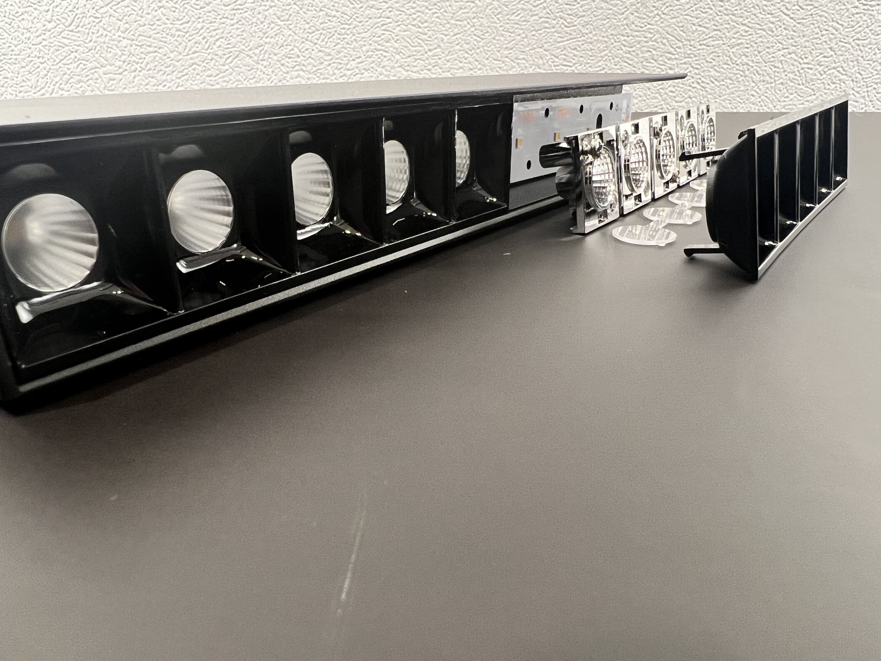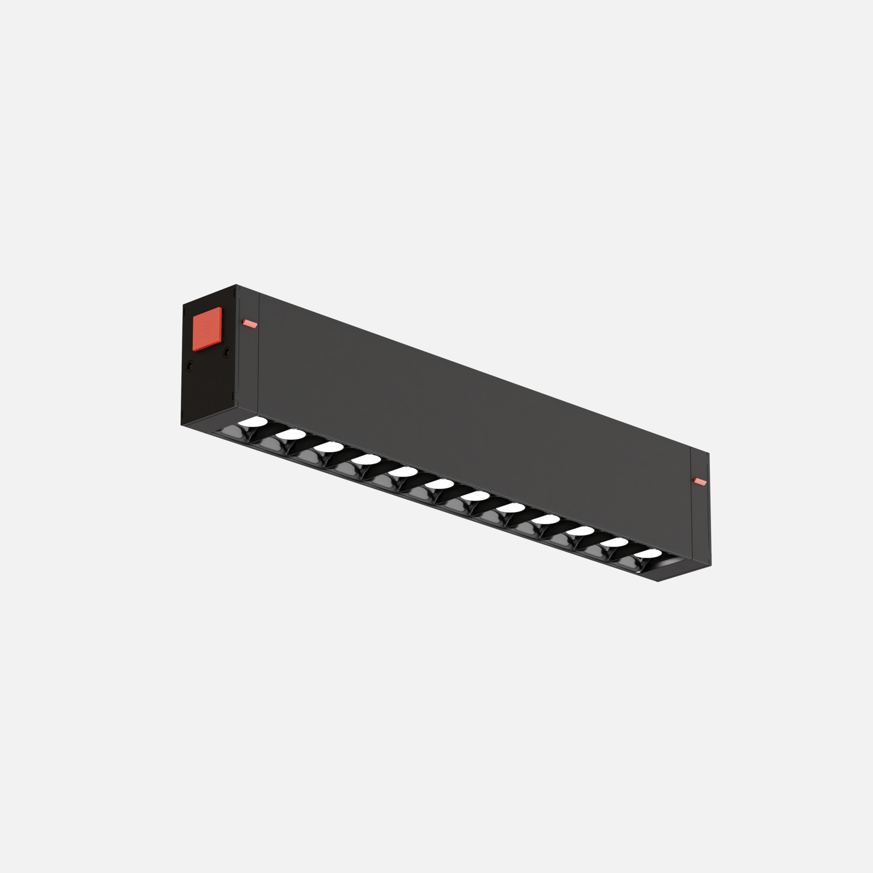 Линейный светильник с оптической системой по технологии Dark Light создает комфортное освещение. Состоит оптика из ряда рефлекторов, каждый из которых утоплен и отделён от соседних чёрной рамкой. Такая конструкция позволяет четко направить световой поток. Черный цвет уменьшает интенсивность и количество бликов от светодиода. Такое освещение наиболее комфортно для глаз.