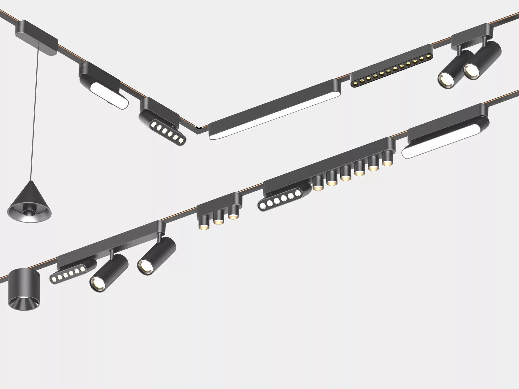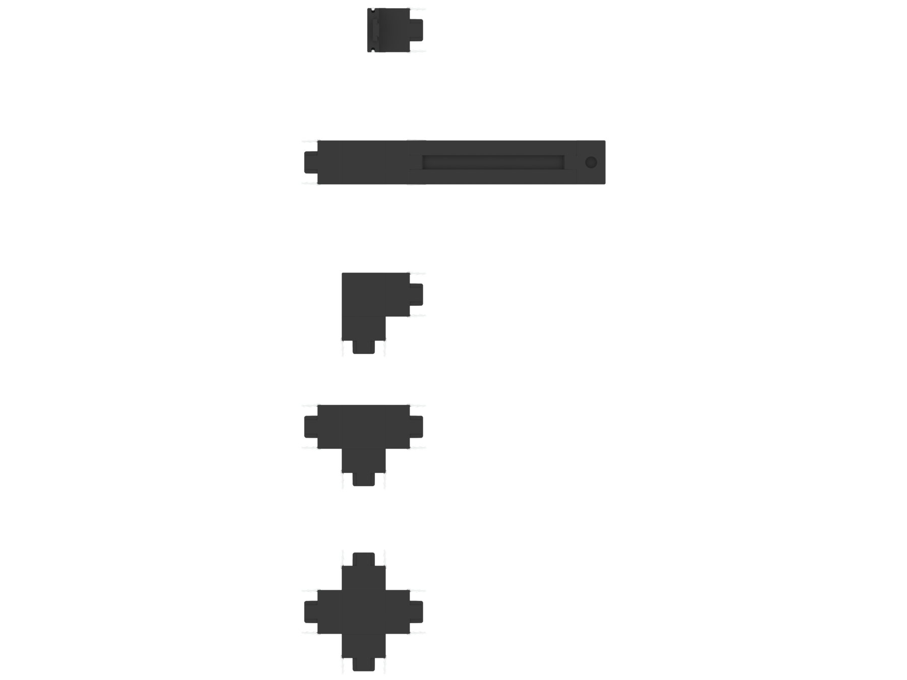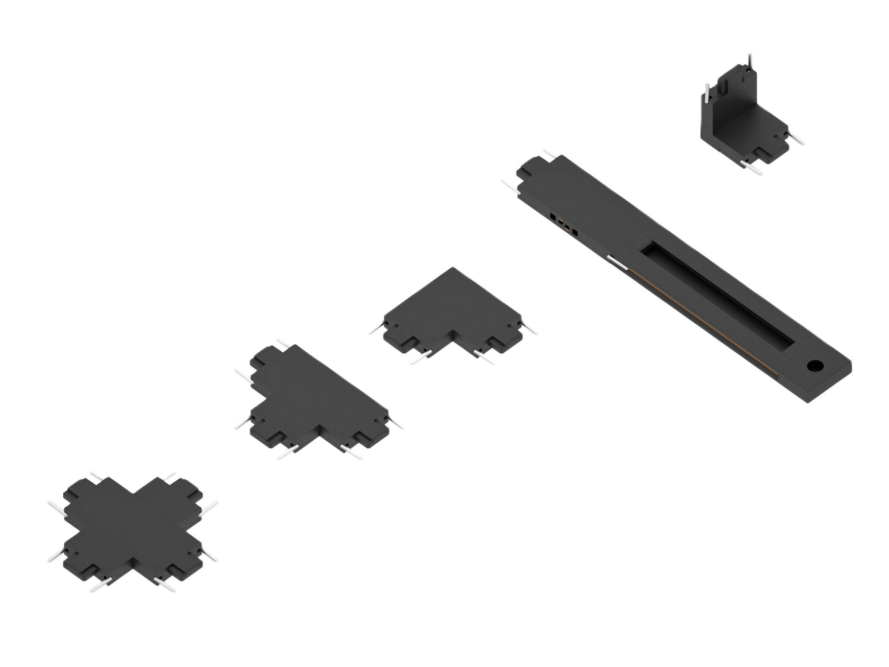 Внутри трека проходит 2 медных провода плоской формы. Напряжение на 2х контактной шине составляет 24V. Трек можно без проблем отрезать в нужный вам размер и создавать непрерывные прямоугольные формы с помощью специальных адаптеров: Прямой соединитель, T-образный, L-образный, X-образный.