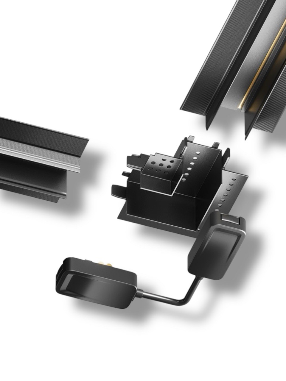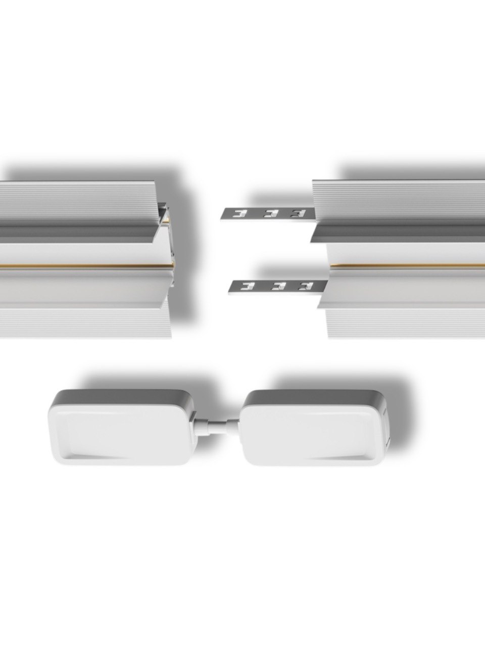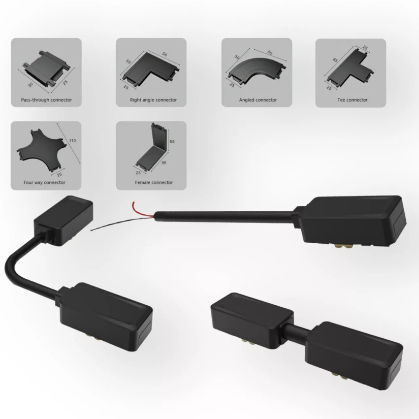 Внутри трека проходит 2 медных провода плоской формы. Напряжение на 2х контактной шине составляет 48V. Трек можно без проблем отрезать в нужный вам размер и создавать непрерывные прямоугольные формы с помощью специальных адаптеров: Прямой соединитель, T-образный, L-образный, X-образный.