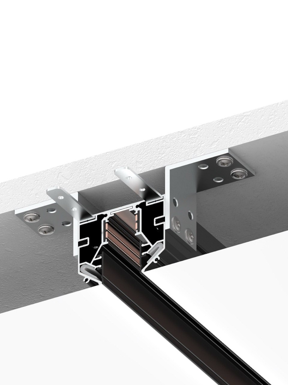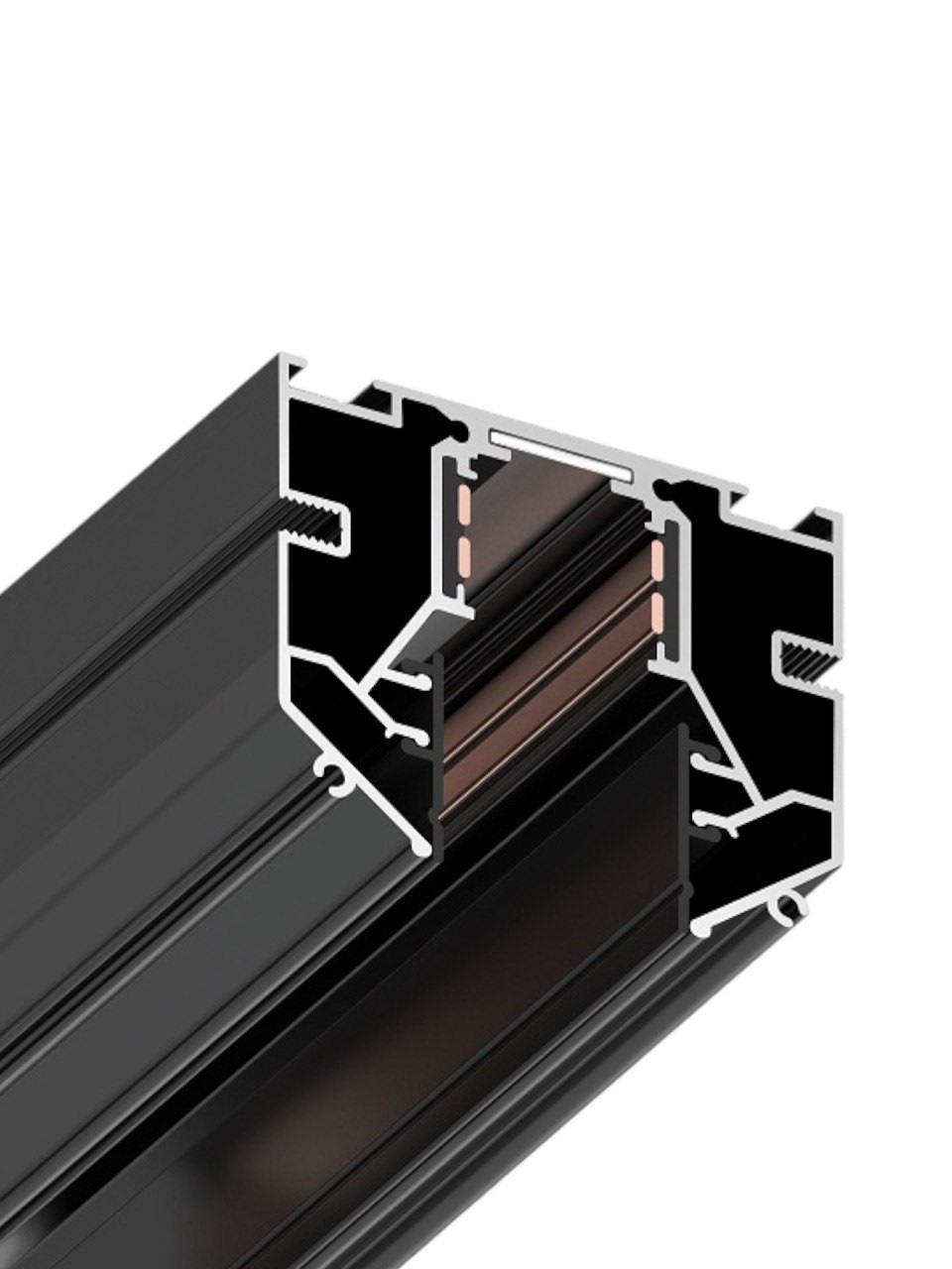 Конструкция магнитного шинопровода позволяет в считанные секунды переместить светильник по длине шины. Питающее напряжение в новой магнитной шинопроводной системе подается на 4 медных провода, проходящие внутри алюминиевого корпуса.